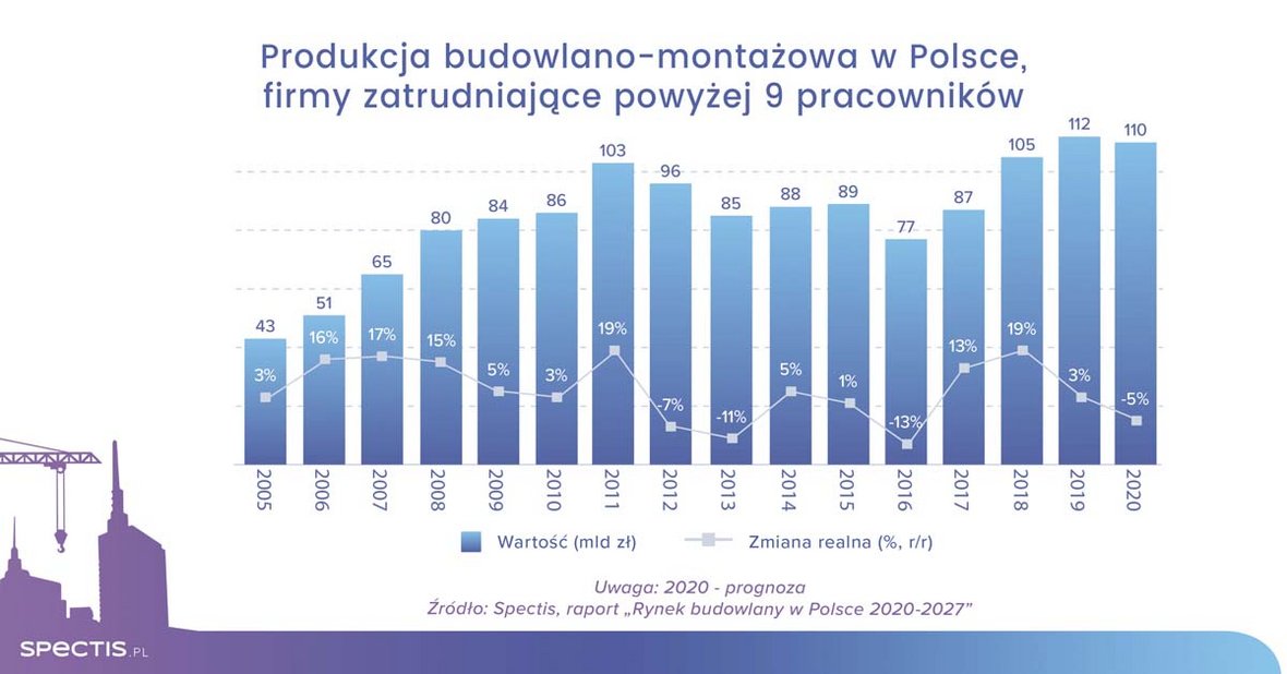 Jak wynika z jesiennej edycji raportu firmy badawczej Spectis zatytułowanego „Rynek budowlany w Polsce 2020-2027”, dzięki stosunkowo dobrym wynikom budownictwa odnotowanym w pierwszym półroczu, prognozy na 2020 r. zostały zweryfikowane w górę. Spectis oczekuje, że realny spadek wartości rynku sięgnie 3% dla pełnej zbiorowości oraz 5% dla firm budowlanych zatrudniających powyżej 9 pracowników, wobec prognozowanych wiosną spadków o odpowiednio 5 i 6%.