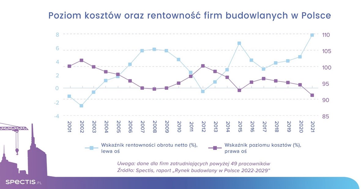 W 2021 r. firmy budowlane w Polsce wyraźnie odczuły wzrost cen materiałów budowlanych i robocizny, jednakże dzięki odpowiedzialnej polityce ofertowej rosnącym kosztom towarzyszył także wyraźny wzrost przychodów. W rezultacie wykonawcy zdołali obniżyć wskaźnik poziomu kosztów branży do 91%, natomiast wskaźnik rentowności obrotu netto zdecydowanie się poprawił i wyniósł rekordowe 7,8%.