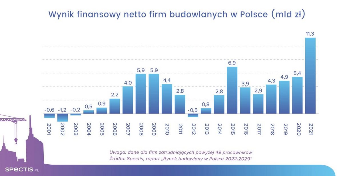 Duża część z nich powinna mieć zatem przygotowaną poduszkę finansową na gorsze czasy, do czego w znaczącym stopniu przyczyniły się wysokie zyski z ubiegłego roku. W 2021 r. grupa 1200 średnich i dużych firm budowlanych wypracowała łączny zysk finansowy netto w wysokości blisko 11,3 mld zł, wobec 5,4 mld zł rok wcześniej.